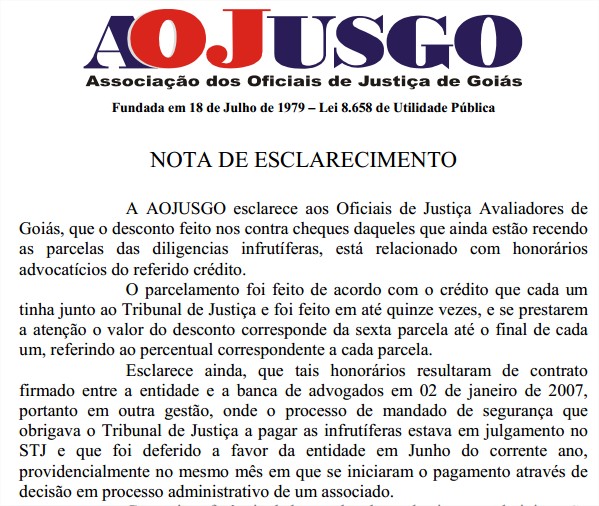 A AOJUSGO esclarece aos Oficiais de Justiça Avaliadores de Goiás, que o desconto feito nos contra cheques daqueles que ainda estão recebendo as parcelas das diligencias infrutíferas, está relacionado com honorários advocatícios do referido crédito.