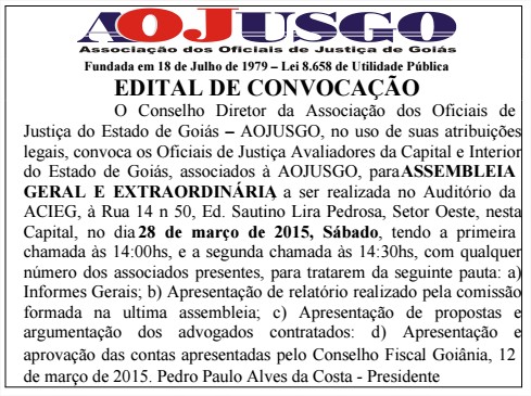 Edital para nova assembleia para o dia 28 de março. O edital foi publicado com destaque no Jornal Diário da Manhã do dia 14/03/2015.