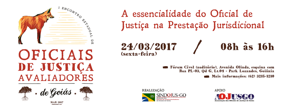 DATA: 24/03/2017 (sexta-feira) TEMA: A essencialidade do Oficial de Justiça na Prestação Jurisdicional HORÁRIO: 08h äs 16h LOCAL: Fórum Cível (auditório) – Avenida Olinda, esquina com Rua PL-03, Qd G, Lt.04 – Park Lozandes, Goiânia. DATA: 25/03/2017 (sábado) TEMA: Confraternização para os encontristas (Dia do Oficial de Justiça) HORÁRIO: 10h LOCAL: Sede recreativa do Sindojusgo – Estrada 105, Chácara 121 – Chácaras de Recreio São Joaquim, Goiânia.