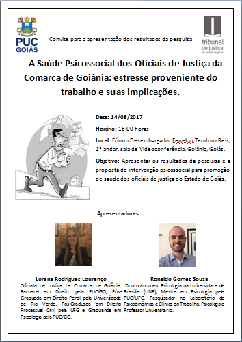 O Sindicato dos Oficiais de Justiça Avaliadores do Estado de Goiás (Sindojusgo) convida seus filiados e a sociedade em geral para a apresentação dos resultados da pesquisa “A saúde psicossocial dos Oficiais de Justiça da Comarca de Goiânia: estresse proveniente do trabalho e suas implicações”. A palestra vai acontecer no dia 14 de agosto, às 16h, na sala de videoconferência do Fórum Desembargador Fenelon Teodoro Reis e é resultado do trabalho realizado pela graduanda em Psicologia pela PUC/GO e também oficiala de justiça, Lorena Rodrigues Lourenço e do professor Ronaldo Gomes Souza, que é doutorando em Psicologia pela UNB e mestre em Psicologia pela PUC/UFG. “Precisava escolher um universo para a pesquisa por isso escolhi Goiânia, mas adianto que os resultados refletem a realidade dos oficiais de justiça em âmbito estadual e até nacional”, explica Lorena. O cotidiano da oficiala de justiça contribuiu para a escolha do tema da pesquisa. “A minha experiência como oficiala de justiça e as inúmeras queixas dos colegas quanto ao estresse proveniente do trabalho fez com que eu me interessasse por esse assunto que já foi abordado em pesquisas do Tribunal de Justiça de Minas Gerais e pela Justiça Federal do Rio Grande do Sul”, ressalta a graduanda. A coleta de dados ocorreu mediante a aplicação do Protocolo de Avaliação dos Riscos Psicossociais no trabalho (PROART) em uma amostra de 85 oficiais de justiça lotados na Comarca de Goiânia. Já a análise dos dados foi feita sob a ótica da Psicodinâmica do Trabalho, com a utilização dos programas IBM-SPSS, que auxilia na análise estatística dos dados quantitativos e IRAMUTQ, que auxilia na análise dos dados qualitativos. Na palestra serão apresentados os resultados da pesquisa e ações necessárias para ajudar na melhoria da qualidade de vida dos oficiais de justiça no trabalho. “Os resultados da pesquisa são surpreendentes. Como representante do sindicato da categoria, tenho certeza que o debate entre os colegas vai gerar bons frutos e novas estratégias para trabalharmos, em parceria com o Tribunal de Justiça, a qualidade de vida do oficial de justiça no estado de Goiás”, explica o presidente do Sindojusgo, Moizés Bento. Além de estar realizada com a conclusão do curso de Psicologia, a oficiala de justiça se alegra em poder contribuir com a categoria. “Não vou adiantar os resultados da pesquisa para que todos os colegas possam participar conosco, mas me sinto realizada em deixar um legado para a valorização do servidor, melhorando sua qualidade de vida e evitando doenças psicossociais. É o pontapé inicial para um trabalho sério e possível de ser realizado”, conclui Lorena.