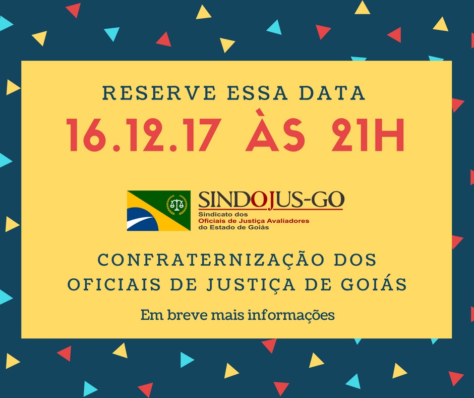 Baile dançante vai marcar fim de ano dos oficiais de justiça O ano está chegando ao fim e temos muito para comemorar. Pensando nisso, a diretoria do Sindicato dos Oficiais de Justiça vai promover no dia 16 de dezembro de 2017, sábado, na Associação dos Magistrados de Goiás (Asmego), a partir das 21h, um baile dançante para marcar o fim desse ciclo e o início de um novo ano cheio de novas oportunidades e conquistas. “Esse ano foi histórico para nós. Acreditamos que muitas coisas boas estão por vir. Fazemos questão de comemorar a virada do ano ao lado dos colegas de trabalho e cônjuges. Será um baile inesquecível”, garante o presidente do Sindojusgo, Moizés Bento. O presidente explica que a cada mês o sindicato está se desenvolvendo como entidade representativa da categoria dos oficiais de justiça. “Temos encabeçado lutas importantes e que buscam a valorização e reconhecimento da nossa função como indispensável para a prestação jurisdicional em Goiás e no Brasil”, completa Moizés. O convite é gratuito e direcionado aos filiados do sindicato, estendendo para um (1) acompanhante. As vagas são limitadas. Então, garanta o seu convite a partir do 20 de novembro. >