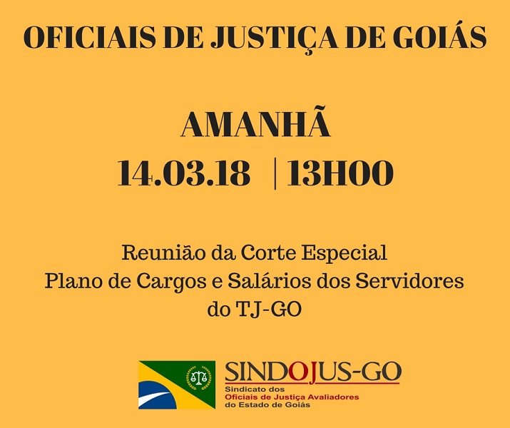 Colegas, é do conhecimento de todos a elaboração e agora a discussão de alterações no PCS – Plano de Cargos e Salários dos servidores do TJGO. É previsto o retorno à pauta da Corte Especial para amanhã (14.03), às 13h. Precisamos acreditar, ficarmos firmes rumo ao nosso objetivo, agindo com foco e determinação. O Sindojusgo convida os nobres Oficiais de Justiça para estarem vigilantes e presentes à referida sessão demonstrando o gigantismo do oficialato goiano. Conclamamos, principalmente os colegas da comarca de Goiânia para que tenham atitude, que se organizem e estejam presentes no TJGO na quarta-feira desta semana. É momento de fazer acontecer. Unidos somos mais fortes! Até lá! Divino Lopes Diretor de Núcleo de Ações Sindicais do Sindojusgo