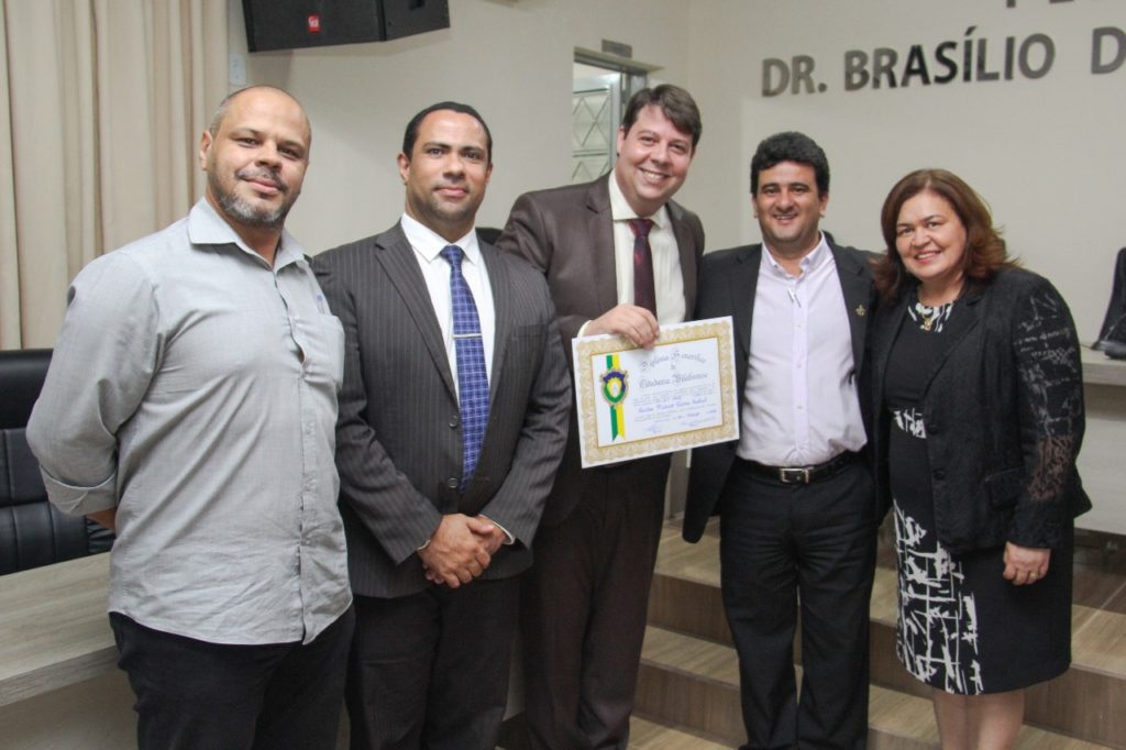 Na última sexta-feira. (09.03), diretores do Sindicato dos Oficiais de Justiça Avaliadores de Goiás (Sindojusgo) prestigiaram a entrega de Título Honorífico de Cidadão Vilaboense, na cidade de Goiás, ao deputado estadual Karlos Cabral (PDT). A sessão solene que aconteceu no plenário da Câmara Municipal de Goiás contou com a presença da prefeita Selma Bastos (PT), vereadores, autoridades militares, religiosas, lideranças sindicais e muitas pessoas da comunidade. O político tem laços estreitos com a cidade de Goiás, desde os tempos que militava na Pastoral da Juventude e tem o município na agenda prioritária de atuação do mandato. “Ficamos engrandecidos com a oportunidade de conhecer mais do trabalho realizado pelo amigo, Karlos Cabral principalmente no que tange a área social. Além disso, ele tem sido um grande parceiro na luta pela manutenção e melhoria dos direitos dos oficiais de justiça”, explica o presidente do Sindojusgo, Moizés Bento. Na ocasião, Moizés também estava representando o presidente da Federação das Entidades Sindicais dos Oficiais de Justiça do Brasil (Fesojus), João Batista Fernandes.
