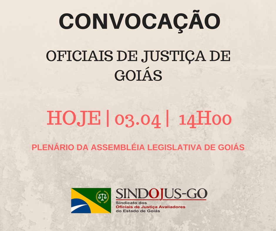Hoje será um dia decisivo pra todos os Oficiais de Justiça e demais servidores do Judiciário Goiano. Nosso futuro depende de nossa participação no presente, com a demonstração de força e união de todos nesta data. Nossa indignação precisa ser revertida em presença, em participação. Arregacemos as mangas e criemos coragem para defendermos nossos direitos. Nossa força é união de cada companheiro, de perto ou de longe, associado ou não. O importante nesse momento é o seu comparecimento e a superação das dificuldades. Todos nós temos que nos comprometer para demonstrarmos junto aos Deputados Estaduais de Goiás, a nossa necessidade e nossa insatisfação com o atraso na aprovação da GJ. Se estivermos todos juntos nessa batalha, com certeza teremos uma grande vitória com a união de toda categoria e a demonstração do poder de convencimento eleitoral. O SINDOJUS- GO está e estará sempre ao seu lado. Vem com a gente e junte-se a nós no plenário da Assembléia Legislativa de Goiás, às 14h. Moizés Bento Presidente do Sindojusgo