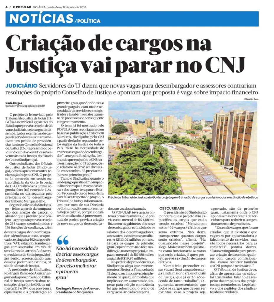 Sindojusgo recorre ao CNJ para impedir extinção de cargos efetivos Vamos recorrer ao CNJ para tentar impedir a extinção dos cargos efetivos do TJ-GO. O projeto enviado à Assembléia Legislativo vai na contramão do que temos negociado com o TJ-GO. O projeto prevê a criação de novas Varas e a extinção de 402 cargos efetivos, incluindo 34 vagas de oficial de justiça. Estão aumentando a sobrecarga de trabalho e diminuindo a mão de obra. Queremos saber qual critério foi utilizado para pedir a extinção dos cargos. Existem comarcas que o oficial de justiça tem cumprido mais de 300 mandados por mês, Um absurdo!!! Leia matéria na íntegra no Jornal O Popular.