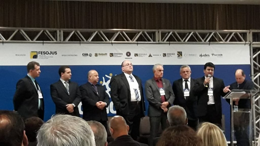O primeiro Congresso Nacional dos Oficiais de Justiça – I CONOJUS, aconteceu na última semana na cidade de Vitória, no Espírito Santo. Realizado pela Federação das Entidades Sindicais dos Oficiais de Justiça do Brasil – Fesojus, o evento contou com palestras e debates que discutiram os principais problemas da categoria em âmbito nacional. Mais de 200 oficiais de justiça participaram do evento. O presidente do Sindicato dos Oficiais de Justiça de Goiás, Moizés Bento ficou impressionado com a estrutura e qualidade das palestras ministradas no Congresso. ˜Foi enriquecedor trocar experiências com profissionais de praticamente todos os estados brasileiros. Percebemos o quanto podemos aprender e também ensinar aos colegas. Estamos ansiosos para o próximo congresso˜, explica Moizés que aproveitou para anunciar que Goiânia foi a cidade escolhida para sediar o próximo Congresso Nacional dos Oficiais de Justiça. Segundo o presidente da Fesojus, João Batista Fernandes, a ideia é realizar anualmente o CONOJUS em diferentes Estados e Regiões do Brasil, levando conhecimento e atualização jurídica aos oficiais de justiça de todo o País. “Com este evento, queremos garantir que todos tenham voz e possam ter o apoio de nossa entidade. Em 2019 estaremos em Goiás para termos mais um ciclo de palestras e troca de experiências”, esclarece. O evento Os participantes do I CONOJUS tiveram a oportunidade de ouvir o Procurador do Município de São Paulo, Kheyder Loyola sobre a busca de novas atribuições para o cargo de Oficial de Justiça face a virtualização processual. Já na palestra do Conselheiro do CNJ, Valdetário Andrade foi possível discutir sobre a possibilidade de padronização dos atos dos Oficiais de Justiça pelo CNJ e novas atribuições face a virtualização da justiça. ” Durante o encontro os palestrantes rebateram os comentários a cerca das perdas as atribuições dos oficiais diante da digitalização. Mas ressaltaram que o que se têm percebido é que os atos de comunicação podem diminuir, mas os atos executórios, que envolvem a humanização das decisões, jamais vão se extinguir. O judiciário tem que ver as pessoas, sentir as pessoas e o oficial de justiça é a porta de entrada”, finaliza o presidente do Sindojusgo. O vice-presidente do Sindojusgo, Eleandro Alves, o advogado, Gleidson Emanuel e o oficial de justiça, Edio Ferreira dos Santos também participaram