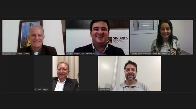 “O poder Judiciário no cenário Político e Econômico da Pandemia e seus reflexos na atividade do Oficial de Justiça” foi tema central de um encontro especial no dia 28-05-20. Tendo como anfitrião o Presidente do SINDOJUS/GO, Moizés Bento, o encontro virtual foi mediado por Carolina Rosa, Diretora do SINDOJUS/GO. Entre os convidados especiais, garantiram a presença João Batista, Presidente da FESOJUS; Karlos Cabral, Oficial de Justiça Deputado Estadual e; João Campos, Deputado Federal.