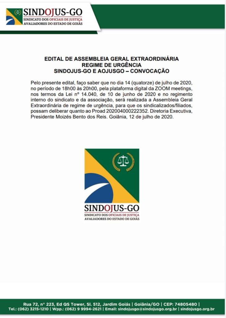 Pelo presente edital, faço saber que no dia 14 (quatorze) de julho de 2020, no período de 18h00 às 20h00, pela plataforma digital da ZOOM meetings, nos termos da Lei nº 14.040, de 10 de junho de 2020 e no regimento interno do sindicato e da associação, será realizada a Assembleia Geral Extraordinária de regime de urgência, para que os sindicalizados/filiados, possam deliberar quanto ao Proad 202004000222352. Diretoria Executiva, Presidente Moizés Bento dos Reis. Goiânia, 12 de julho de 2020.