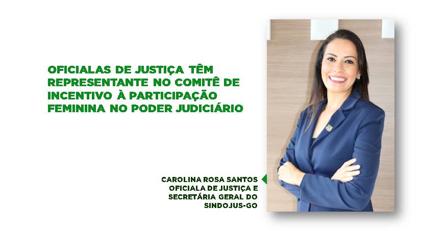 O SINDOJUS-GO tem a honra de comunicar que o Comitê de Incentivo à Participação Feminina no Poder Judiciário do Estado de Goiás terá como membro uma representante das Oficialas de Justiça do TJ-GO: Carolina Rosa Santos, Oficiala de Justiça da comarca de Senador Canedo e Secretária Geral do SINDOJUS-GO. De acordo com solicitação realizada pelo SINDOJUS-GO, ao Exmo. Senhor Desembargador Walter Carlos Lemes – Presidente do Egrégio Tribunal De Justiça Do Estado De Goiás, em atendimento ao que determina a Resolução nº 255/2018 do CNJ, que “Institui a Política Nacional de Incentivo à Participação Institucional Feminina no Poder Judiciário”, a Presidente do Comitê, Desembargadora Sandra Regina Teodoro Reis, manifestou-se favorável à solicitação, também deferida pelo Presidente do TJGO, que resultou na lavratura do Decreto Judiciário n. 1.420/2020 que alterou o Decreto Judiciário nº 1.986/19, incluindo a oficiala neste importante projeto como representante das Oficialas de Justiça e também das servidoras públicas do interior
