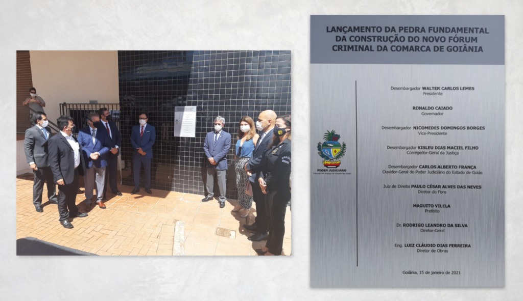 O SINDOJUS-GO prestigiou o Lançamento da Pedra Fundamental da Construção do Novo Fórum Criminal da Comarca de Goiânia, no dia 15/01/21, na av. PL3, Lt. 4, Park Lozandes (Centro de Distribuição), ao lado do Fórum Civel. A convite do Presidente do Tribunal de Justiça do Estado de Goiás, Desembargador Walter Carlos Lemes e o Juiz de Direito Diretor do Foro, Dr. Paulo César Alves das Neves. Representando o SINDOJUS-GO, participaram do evento Moizés Bentos dos Reis, Presidente e José Moizaniel Formiga Dias, Diretor Financeiro e Administrativo.