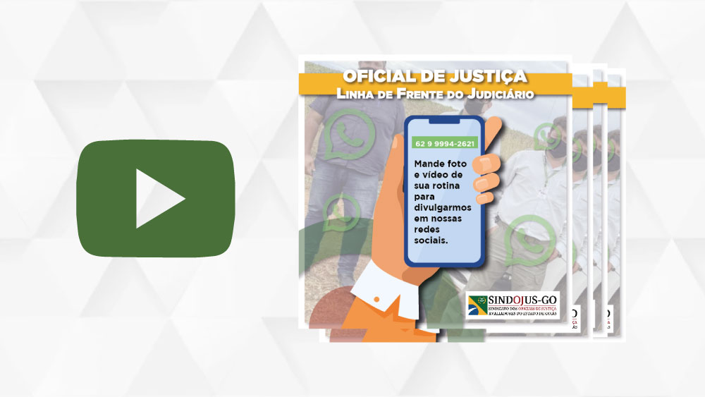 O SINDOJUS-GO abriu a campanha “Oficial de Justiça – Linha de Frente do Judiciário”. Para que você possa fazer parte, encaminhe foto e vídeo de sua rotina para o WhatsApp do SINDOJUS-GO pelo contato: https://wa.me/5562999942621. A nova campanha começou em março de 2021 e contempla outras séries que vêm sendo trabalhadas ao longo dos anos. O objetivo é oportunizar a sociedade de conhecer um pouco sobre o dia a dia dos Oficiais e Oficialas de Justiça, mostrando que mesmo durante a pandemia, os servidores estão nas ruas para levar justiça.