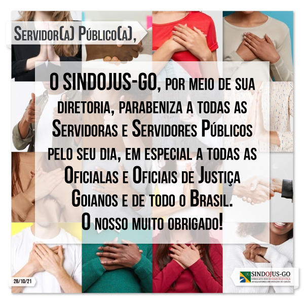Neste dia 28 de outubro o SINDOJUS-GO – Sindicato dos Oficiais de Justiça Avaliadores do Estado de Goiás, por meio de sua diretoria, parabeniza a todas as Servidoras e Servidores Públicos pelo seu dia, em especial a todas as Oficialas e Oficiais de Justiça Goianos e de todo o Brasil.