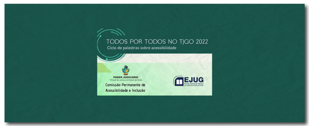 A Escola Judicial de Goiás – EJUG, em conjunto com a Comissão Permanente de Acessibilidade e Inclusão do Poder Judiciário goiano, tem a honra de convidar Vossa Senhoria para o evento de abertura do Ciclo de Palestras sobre Acessibilidade e Inclusão – Todos por Todos no Tribunal de Justiça do Estado de Goiás, a realizar-se no dia 30/09/22, no auditório da EJUG, Av. Assis