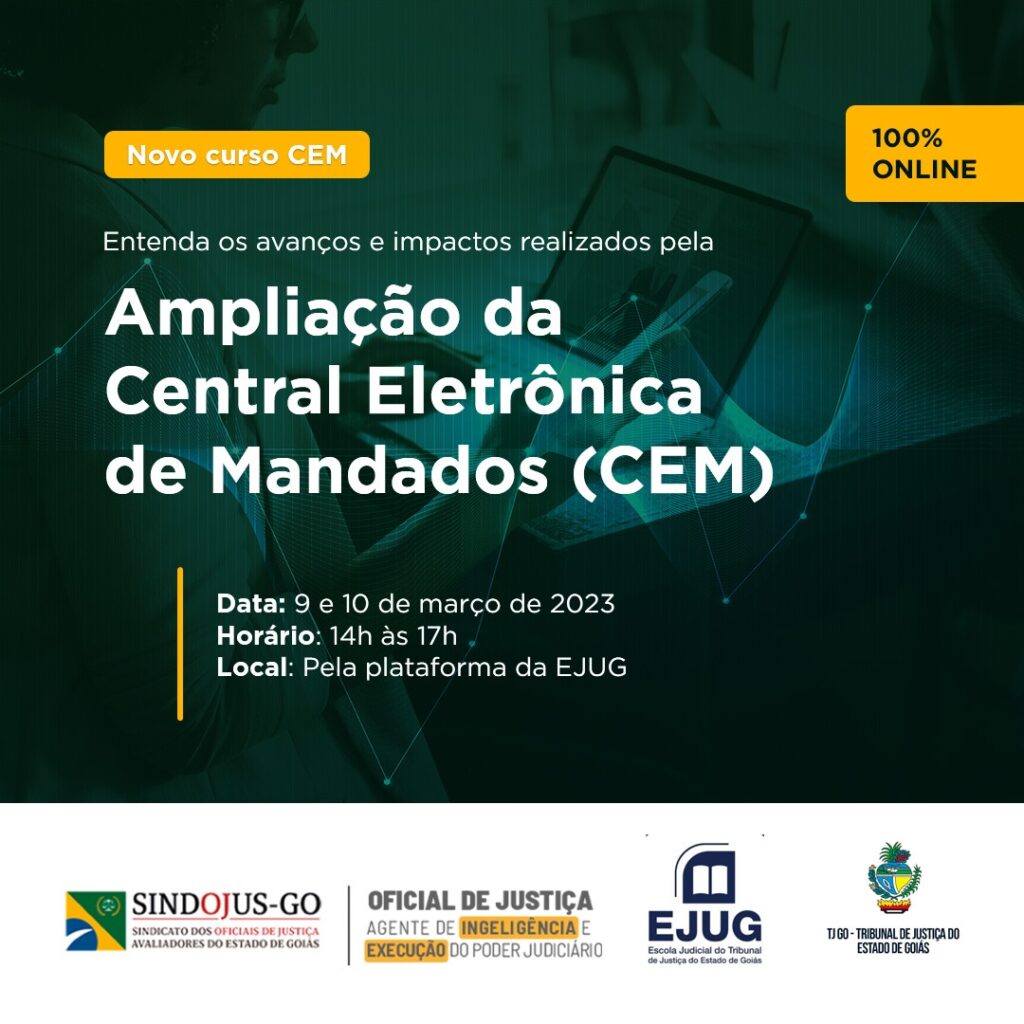 Servidores de todo o Estado serão capacitados para utilização da Central Eletrônica de Mandados (CEM). Nos dias 9 e 10 de março, das 14h às 17 horas, ocorre uma nova etapa do curso, que irá promover estudos para expansão do Projeto Central Eletrônica de Mandados. O curso será totalmente on-line, pela plataforma da Escola Judicial do Tribunal de Justiça do Estado de Goiás – EJUG