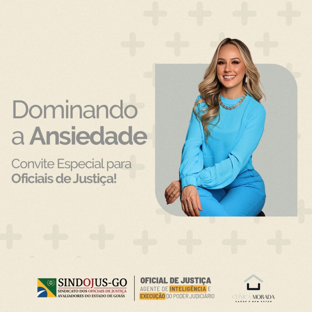 O SINDOJUS-GO e a oficiala e psicóloga Lorena Lourenço convidam todos os oficiais e oficialas de justiça para participarem do minucurso Dominando a Ansiedade, que será realizado no dia 1º de setembro, das 8h às 17 horas, na Clínica Morada, no Setor Marista.