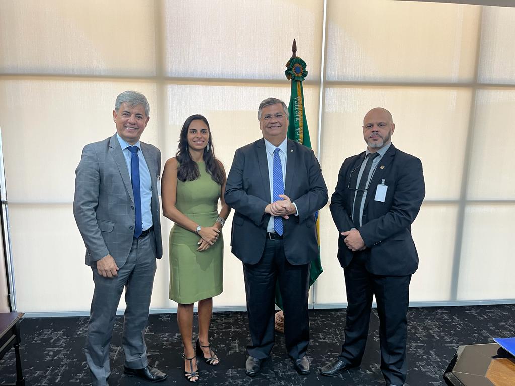 Representantes do Oficialato de Justiça se reuniram, nesta quarta-feira, 18, com o ministro de Estado da Justiça e Segurança Pública, Flávio Dino, em Brasília. O presidente da Associação Federal dos Oficiais de Justiça do Brasil (AFOJEBRA), Mário Medeiros Neto; a presidente da Associação Nacional dos Oficiais de Justiça Avaliadores Federais (FENASSOJAF), Mariana Liria, e o presidente e o vice-presidente da Federação das Entidades Sindicais dos Oficiais de Justiça do Brasil (FESOJUS-BR), João Batista Fernandes de Sousa e Eleandro Alves Almeida, respectivamente, levaram ao ministro Flávio Dino solicitações dos oficiais de justiça do Brasil, cujo objetivo é aprimorar a prestação jurisdicional. Esta foi a primeira vez que representantes do oficialato foram recebidos por um ministro da Justiça.